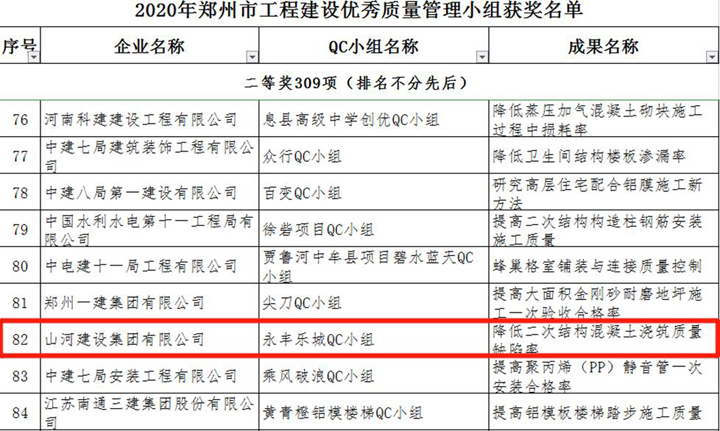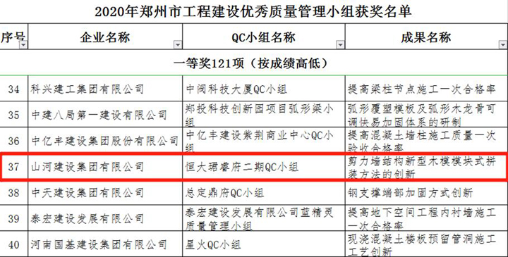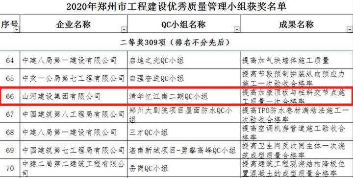 3月23日,鄭州市建筑業(yè)協(xié)會發(fā)布《關于表彰2020年鄭州市工程建設優(yōu)秀質量管理小組活動成果的通知》,山河建設集團河南公司申報的三項成果榜上有名,恒大珺睿府二期QC小組獲得一等獎,清華憶江南二期QC小組、永豐樂城QC小組分別獲得二等獎。