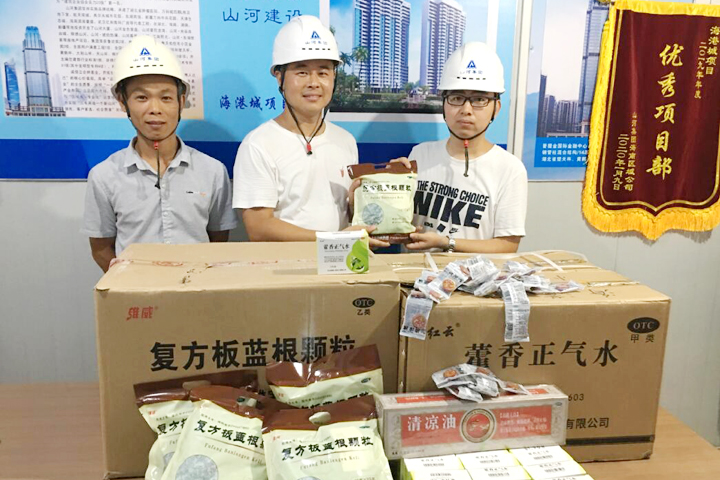 公司代表分別前往各在建項目,為大家送上板藍根、藿香正氣水、清涼油等防暑降溫藥品,保證每一位現(xiàn)場施工工人安全度夏。同時,公司代表帶去了領(lǐng)導(dǎo)的關(guān)心和囑托,對一線人員戰(zhàn)高溫、斗酷暑、保生產(chǎn)給予了高度肯定,囑咐大家在夏季工作中要注意防暑降溫,在確保個人安全的前提下做好安全生產(chǎn)。