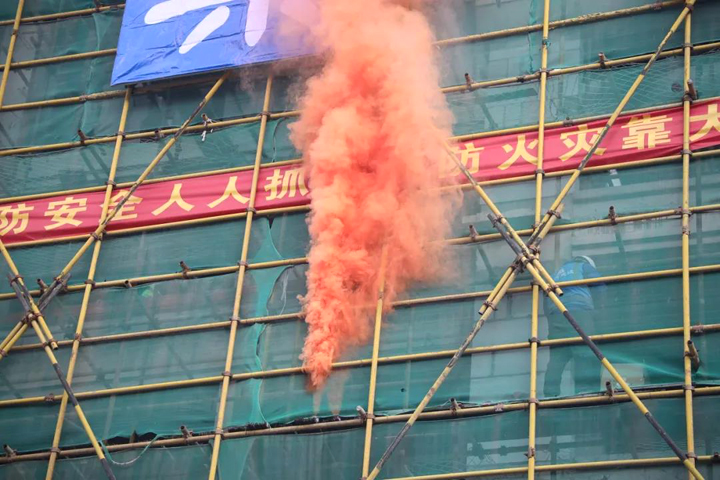 “失火了!”一陣急促的喊聲打破了施工現(xiàn)場的平靜,一股“濃煙”從正在建設的樓棟里冒出,形勢緊急。“立即啟動應急救援預案!應急小組各就各位!”隨著項目經(jīng)理一聲令下,“事故現(xiàn)場”迅速展開救援……