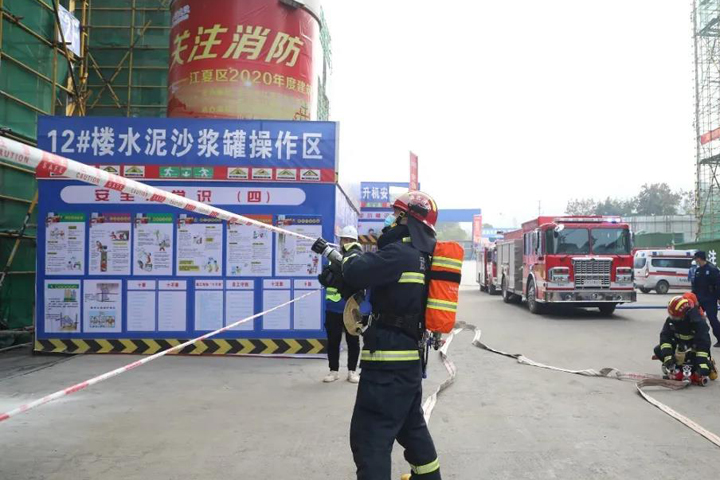 這是武漢市江夏區(qū)2020年度建筑工程消防應急救援演練活動現(xiàn)場的一幕,此次活動在山河建設集團總承包公司經(jīng)發(fā)·龍湖·云山居項目舉行。11月30日上午,來自江夏區(qū)住房和城鄉(xiāng)建設局、應急管理局、建筑管理站、消防救援大隊及龍湖地產(chǎn)等單位的200余名代表近距離觀摩了演練。
