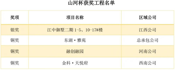 山河杯:“山河杯”是集團工程質(zhì)量最高獎項,要求申報項目達到一定規(guī)模,完成竣工驗收備案,經(jīng)過一年使用沒有發(fā)現(xiàn)質(zhì)量缺陷和質(zhì)量隱患,獲得項目所在地優(yōu)質(zhì)結構工程、優(yōu)質(zhì)建筑工程質(zhì)量獎項等。