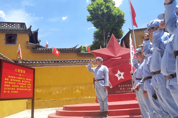 上午9時(shí),全體黨員、預(yù)備黨員、發(fā)展對(duì)象、入黨積極分子等近50人整裝出發(fā),乘車(chē)前往120公里外的丹桂紅軍村。這個(gè)看起來(lái)不起眼的小村莊,見(jiàn)證了中央紅軍巧渡金沙江的偉大壯舉,也見(jiàn)證了中國(guó)革命史上的一次重大轉(zhuǎn)折。抵達(dá)目的地后,大家身著戎裝,英姿颯爽地走進(jìn)丹桂紅軍村,開(kāi)始了這場(chǎng)紅色之旅。