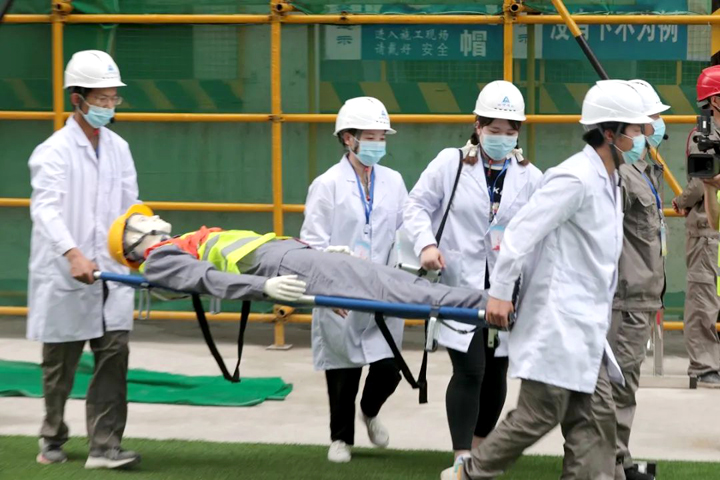 項(xiàng)目經(jīng)理發(fā)出指令,立即啟動(dòng)應(yīng)急救援預(yù)案,同時(shí)撥打120求助,并向上級(jí)單位報(bào)告。警戒隔離組、搶險(xiǎn)救援組、醫(yī)療救護(hù)組先后進(jìn)入事發(fā)區(qū)域,拉設(shè)警戒區(qū),檢查傷者情況并進(jìn)行初步包扎處理,撤離作業(yè)人員,將傷者抬上擔(dān)架送上救護(hù)車,一系列行動(dòng)有力有序,“受傷工人”得到了及時(shí)救治。