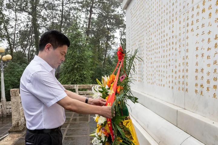 走過149級長長的臺(tái)階,雄偉莊嚴(yán)的革命烈士紀(jì)念碑映入眼簾。集團(tuán)兩名黨員代表抬著花籃緩步向前,擺放到紀(jì)念碑基座上,黨委書記程理財(cái)上前仔細(xì)整理緞帶,全體黨員向烈士紀(jì)念碑深深鞠躬,表達(dá)了無限的敬意與懷念。天空中的雨簌簌而下,如泣如訴,也在為烈士致哀。