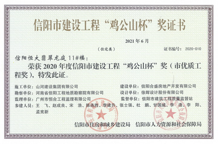 [河南公司]山河集團(tuán)河南公司恒大翡翠龍庭項(xiàng)目榮獲信陽市“雞公山杯”獎(jiǎng)