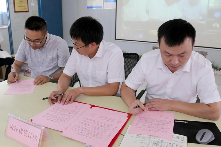 黃超恒、汪俊臣與各在建項(xiàng)目負(fù)責(zé)人簽訂履職責(zé)任承諾書。各項(xiàng)目部向公司鄭重承諾,堅(jiān)決遏制安全事故,全面完成2021年度安全生產(chǎn)責(zé)任目標(biāo)。