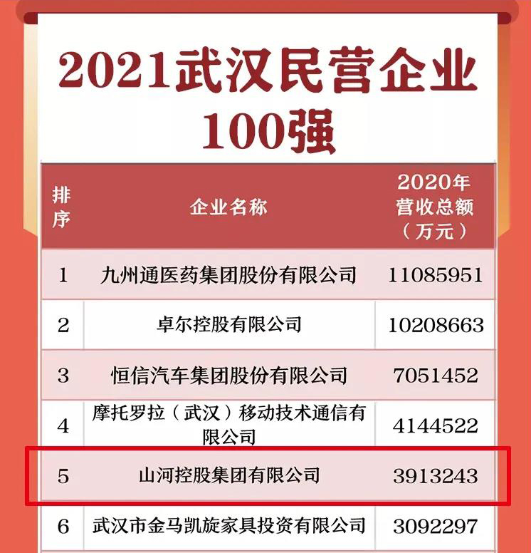 山河集團名列“2021武漢民營企業(yè)100強”第5位