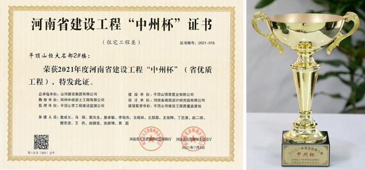 近日,河南省人力資源和社會保障廳、河南省住房和城鄉(xiāng)建設(shè)廳共同頒發(fā)“2021年度河南省建設(shè)工程中州杯(省優(yōu)質(zhì)工程)獎”,山河建設(shè)集團河南公司承建的平頂山恒大名都2#樓喜獲“中州杯”榮譽。這是河南省建設(shè)工程質(zhì)量最高獎,代表著全省工程建設(shè)質(zhì)量的最高水平。