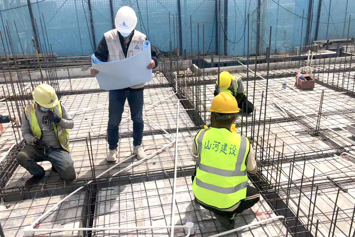 ▲中山農(nóng)商銀行項目施工人員進行負3層地下室底板鋼筋綁扎