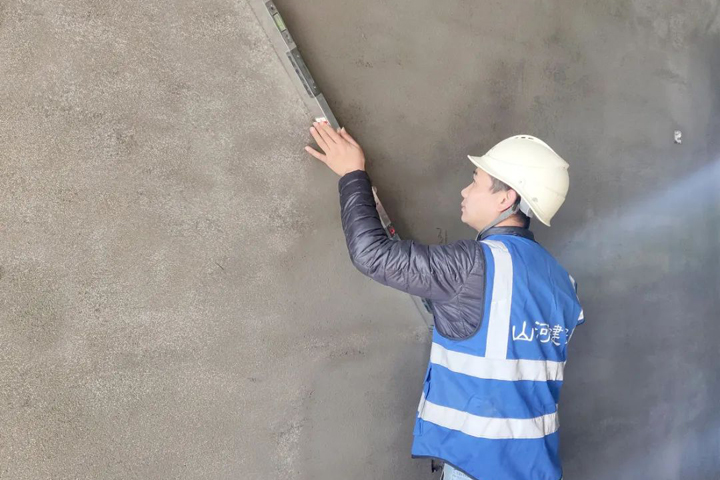 ▲新余聯(lián)發(fā)永康狀元府項目實測員在檢查墻面平整度